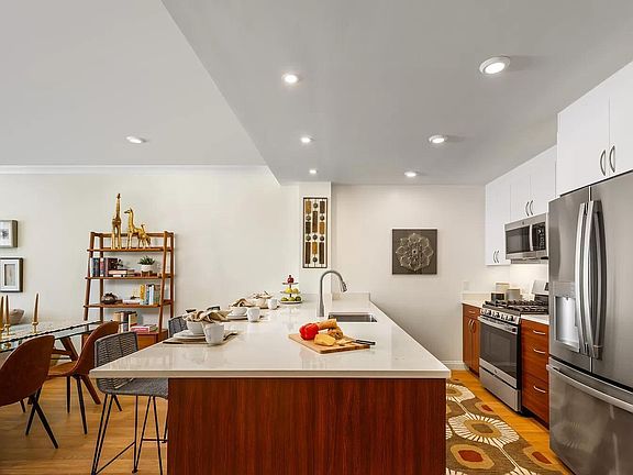 TWO MONTHS FREE RENT! No Broker Fee Light and bright open floor plan Brand new construction Light and bright open floor plan Engineered hardwood floors throughout Crown molding Recessed lighting Custom maple kitchen cabinets Stainless steel GE appliances Breakfast bar Quartz kitchen countertops Primary bedroom suite with custom closet and private bath Carrera marble bath countertops Deluxe closet storage systems In-unit washer and dryer Outdoor parking $50 Garage $150-$200