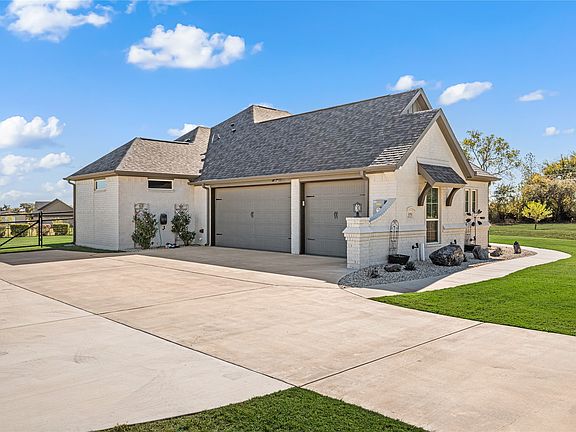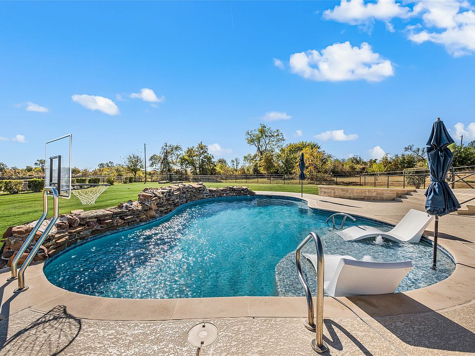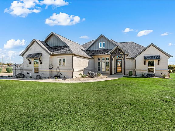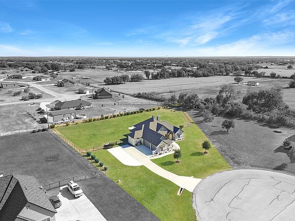 Experience the perfect blend of country charm and modern elegance in this stunning custom-built 3-bedroom, 2-bath home with an office, a spacious 3-car garage, and resort-style pool, all beautifully situated on over an acre at the end of a quiet cul-de-sac. This exceptional property offers the ideal combination of comfort, craftsmanship, and modern luxury. Inside, an open-concept layout is thoughtfully designed for effortless entertaining and everyday living. The living area showcases beautiful views of the property and flows seamlessly into a gourmet kitchen featuring granite countertops, custom cabinetry, stainless steel appliances, and an oversized island, perfect for casual mornings or weekend gatherings. The private primary suite is a retreat of its own, complete with a luxurious spa inspired bath featuring dual vanities, soaking tub, walk-in shower, and an expansive closet. Throughout the home, the attention to detail shines, from premium finishes and custom touches to the epoxy-coated garage floor and numerous thoughtful upgrades. Step outside to your personal backyard paradise, where a resort style pool with a cascading waterfall takes center stage. A large, covered patio with a stone fireplace provides the perfect place to relax, unwind, and enjoy peaceful evenings under the Texas sky. The fully fenced property offers privacy and plenty of space to enjoy life at your own pace. With its prime location outside city limits and unmatched charm, this exceptional home truly feels like your own private retreat the moment you arrive. No HOA
