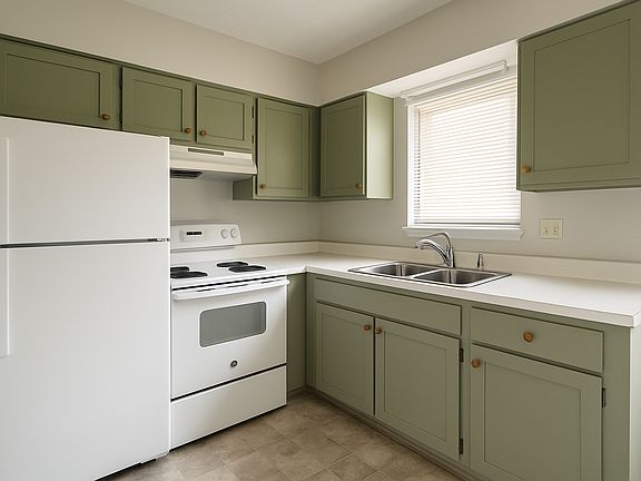 Mature treesOriginal almond tubSage-green shaker cabinetsClean modern finishesWide gently sloping lawnLow-maintenance stuccoBrand-new neutral carpeting