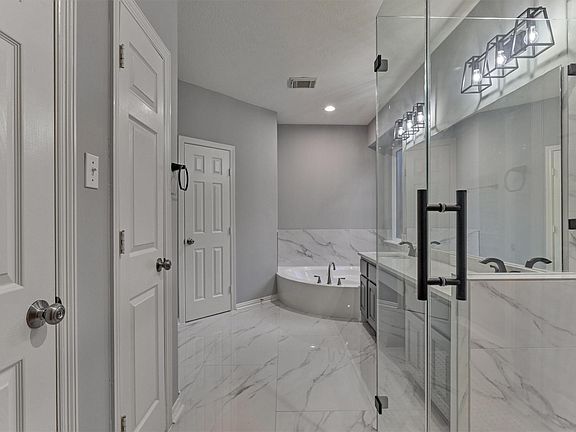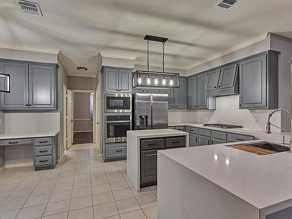 Beautifully updated and move-in ready! This spacious 4-bedroom home features high ceilings in the entry and family room, a private primary suite downstairs, and a versatile upstairs teen suite. The remodeled kitchen features GE stainless steel appliances, a gas cooktop, a convection oven, quartz countertops, and a farmhouse sink. Additional rooms include an office and formal dining room—perfect for work or entertaining. The upstairs teen suite offers a large bedroom with a custom closet system, a private shower/tub bath, and an adjoining den. The primary bath has been fully renovated with quartz counters, his-and-hers closets, and a seamless glass shower. Enjoy a new roof, fresh paint, updated fixtures and fans, and a detached two-car garage. Relax on the wooden deck overlooking the backyard. Conveniently located near neighborhood parks, Alden Bridge Park and pool, top-rated schools, shopping, and with easy access to I-45—this home offers comfort, style, and an unbeatable location!