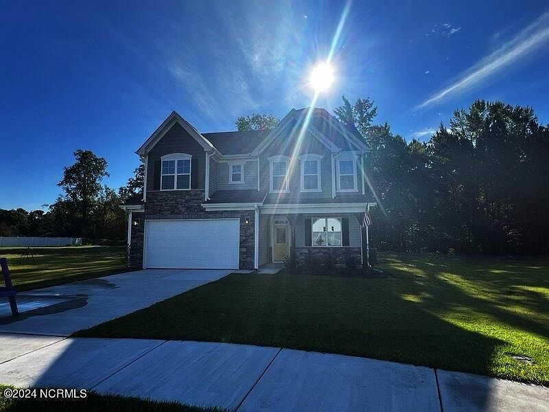 Turn your property dreams into reality with this exquisite 2-story home featuring 4 beds and 2.5 baths. Constructed with a sturdy wood frame, vinyl siding, and elegant stone accents, this home combines style and durability. Enjoy the outdoors on the front porch or covered back patio. Inside, the welcoming foyer leads to a flex room and a morning room. The kitchen boasts a spacious island, granite countertops, electric oven, microwave, dishwasher, pantry, and tiled backsplash, seamlessly flowing into the dining area. The home features laminate, carpet, and vinyl flooring, recessed lighting, and ceiling fans. Upstairs, find a loft, a laundry room, and all bedrooms. The primary suite offers a tray ceiling, walk-in shower, dual vanities, water closet, linen closet, and walk-in closet. One guest room has a walk-in closet, and the guest bathroom features dual sinks. Additional amenities include a pull-down attic and a 2-car garage. Designed for modern living, this home offers both comfort and functionality.