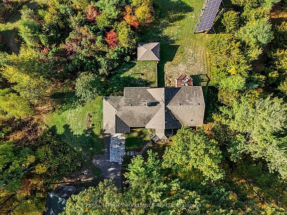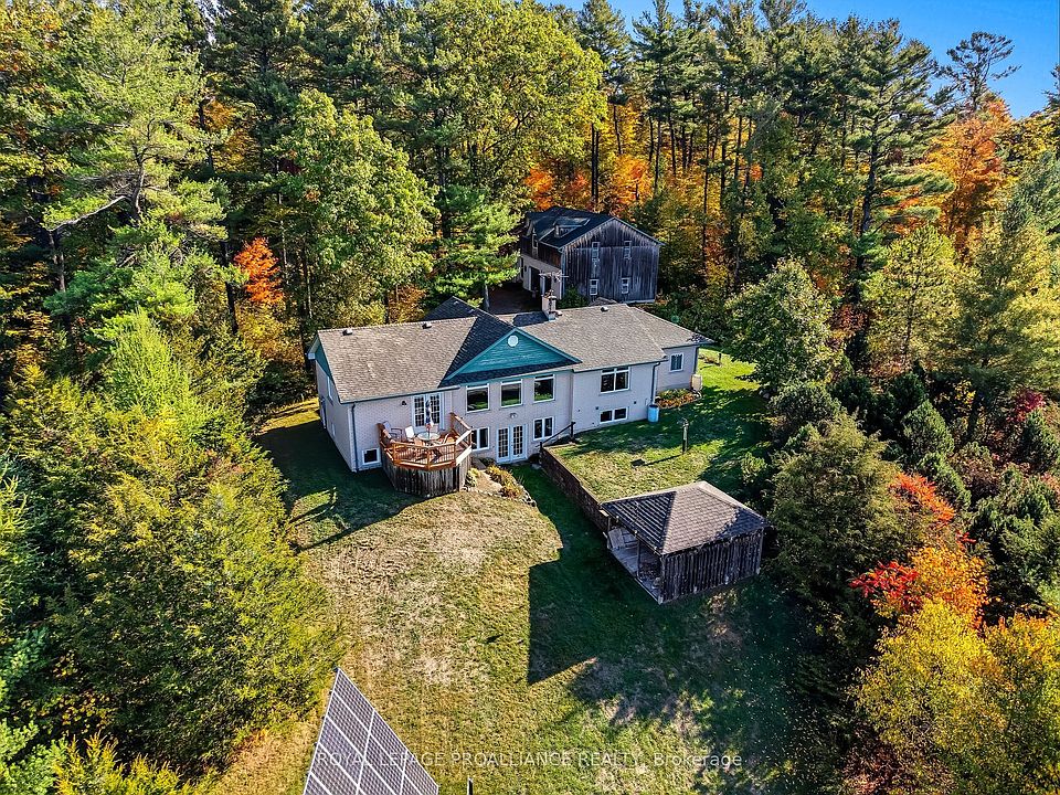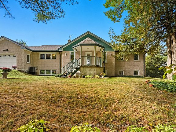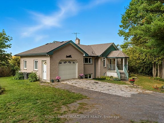 Nestled on 8.3 acres of peaceful countryside just five minutes from Highway 401, this custom-built home offers a rare blend of privacy, nature, and convenience. Surrounded by mature trees, it provides a tranquil retreat where you can enjoy the peacefulness of rural living without sacrificing easy access to town amenities and commuter routes. Built in 2003, this solid all-brick raised bungalow reflects craftsmanship and care in every detail. The main living area welcomes you with a cathedral ceiling, expansive windows framing panoramic views, and a striking beech wood accent wall sourced from the property itself. A mix of hickory, white ash, and oak hardwood flooring from the property adds warmth and character. The bright, spacious kitchen offers generous countertop and cupboard space ideal for everyday living or entertaining. The primary bedroom features locally-sourced black cherry hardwood flooring, a walk-in closet, and an ensuite featuring in-floor heating; walkout access to a cedar deck overlooks the beautiful natural surroundings. The lower level offers a cozy recreation room complete with wood stove, two huge additional bedrooms (one with an ensuite), a cold room, and a walkout to the back garden and wood shed. A major bonus is the impressive 40 ft by 60 ft outbuilding complete with a heated, insulated workshop, a two-car garage designed for storage, large vehicles, boats, or trailers, and further space upstairs. With 60 Amp service and solid 12" on-centre joists, it's ideal for hobbyists or trades people. Heating is a combination of a boiler and radiant heating. Updates include oil tank (2019), roof architectural shingles (2022), primary room cedar deck (2024), air conditioner (2025). Adding further value, this property benefits from the transferable MicroFIT contract with Ontario Hydro generating approximately $10,000 per year for the next four years at $0.802/kWh, an exceptional opportunity for the next owner of this private, well-cared-for retreat.