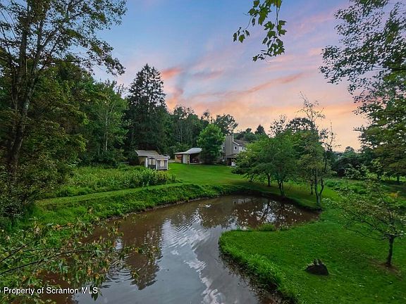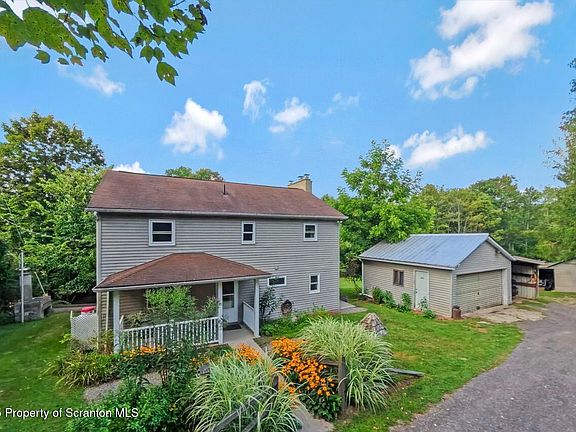 Nature is calling with this 3-bedroom, 2-bath, 2-story home situated on 13.84 mostly wooded acres in Dalton, PA, within the Tunkhannock Area School District. Originally built in 1940, the home was completely rebuilt and expanded in 1998, retaining just three original walls and adding a second floor. The first floor offers an open layout with a spacious kitchen, dining area, and living room featuring a wood-burning fireplace, along with a full bath and laundry area. Upstairs, you'll find three bedrooms, including a large master, and an additional full bath. A floored walk-up attic and basement provide ample storage. Enjoy the peace and quiet from the covered back deck overlooking a tranquil pond. Additional features include a detached 1-car garage with an attached carport, plus a separate shed with carport. Tucked away off a private road, this home offers exceptional privacy and seclusion, with a deeded 50-foot right-of-way easement allowing a neighbor access to their land. Perfect for nature lovers seeking a private retreat.