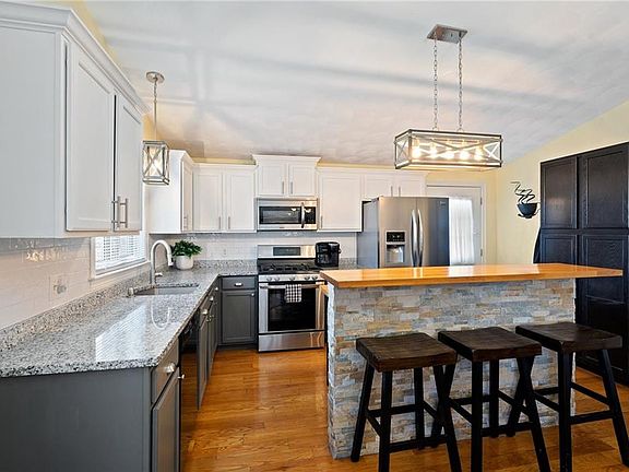 Move right into this beautifully updated ranch. Three good size bedrooms with ceiling lights and fans and new laminate floors. The bathroom has a ceramic tile floor. The kitchen has new granite countertops, an island with a breakfast bar that seats 3-4 people, and a stainless range, microwave, dishwasher and refrigerator. The disposal is installed, but it has been disconnected. The kitchen flows into the livingroom/diningroom, complete with new hardwood floors, cathedral ceiling, wainscoting, and a bow window. Newly painted rooms. The lower level, with a spacious familyroom and space for a small dining set, is great for entertaining. Three ceiling fans and its own thermostat keep the room comfortable all year long. Enjoy sitting on the patio in the fenced in yard, during the warmer weather. The shed is great for storage. The home is conveniently located near shopping, schools, and major routes.
