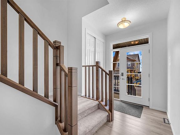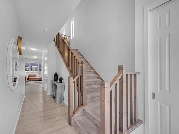 This beautifully designed 6 bedrooms, 4.5 bath home showcases craftsmanship, functionality, and style across every level — perfect for growing or multi-generational families. Step inside to a welcoming open layout with railing throughout the stairs, a spacious living area filled with natural light from large windows, and 9-foot ceilings creating an airy feel. The gourmet kitchen impresses with full-height cabinetry, granite countertops, stainless-steel appliances, a chimney hood fan, and a generous SPICE KITCHEN complete with pantry and extra cabinetry — ideal for large family cooking. A half bathroom, mudroom, and a well-planned dining area complete the main floor, designed for both comfort and entertaining. Upstairs offers four spacious bedrooms, including a luxurious primary suite with a tiled standing shower and walk-in closet. The upper level also features three full bathrooms, a bright and open BONUS ROOM, and a dedicated laundry area for everyday convenience. The basement is a standout feature — a fully developed LEGAL SUITE with a separate side entrance, two bedrooms, a full kitchen, and a living area — an incredible mortgage helper or ideal space for extended family. Located steps away from Carrington Plaza, offering No Frills, McDonald’s, and a variety of retail and dining options, plus quick access to Stoney Trail for effortless commuting. This is the perfect blend of elegance, space, and practicality — a great opportunity in one of NW Calgary’s most sought-after neighbourhoods.