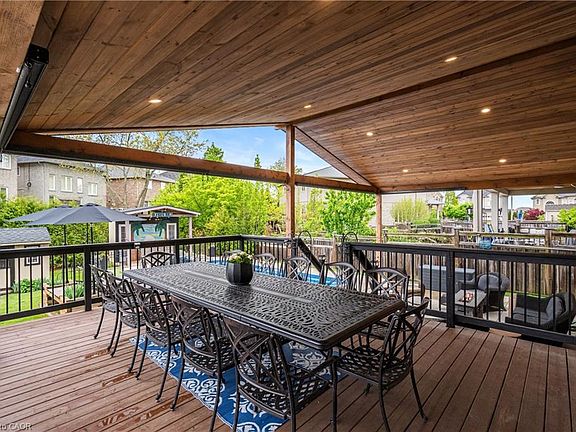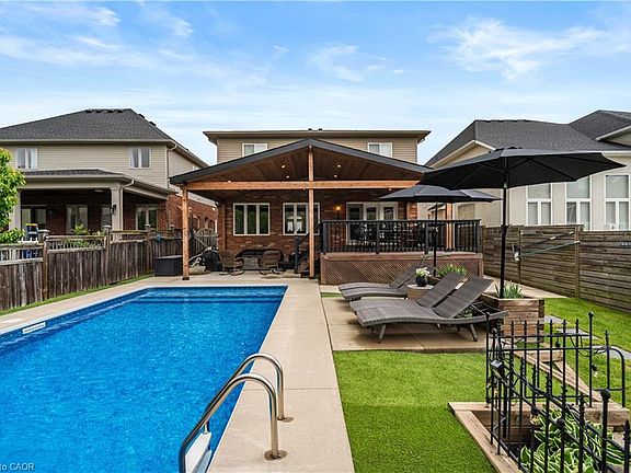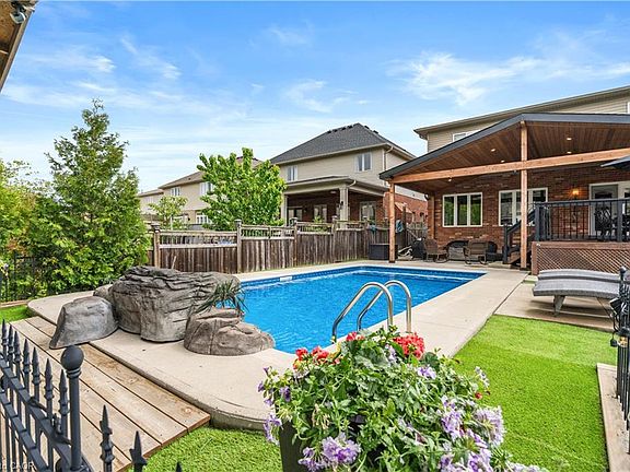 A Rare Lot. and a remarkable home. Stretching 169 feet deep, this is the largest lot on the street—and it shows. The backyard is the kind of space people search for: heated saltwater pool, oversized arched wood-covered patio with pot lights, cabana with change room, pull-down privacy blinds, and enough room to host, relax, or simply enjoy your own quiet retreat. Inside, the home offers a layout that’s both generous and thoughtful. Five bedrooms upstairs, two more in the finished basement (2023), and a main floor that’s open, bright, and designed to make everyday living feel elevated. The kitchen features quartz countertops, custom backsplash, a six-burner gas cooktop, a deep chef-style sink, and a large island with seating for six. It flows effortlessly into a family room with wall-to-wall windows, gas fireplace, custom built-ins, concealed TV wiring, and a wall-to-wall bench for added comfort and storage. Recent upgrades include, a large covered outdoor porch (2023), a new roof (2021), furnace and tankless water heater (2022), concrete stairs at both side entrances (2023), EV-ready garage, and an Ecobee Smart Thermostat. Located on a quiet, friendly street in Ancaster’s Meadowlands, this home offers rare outdoor space, modern upgrades, and a layout built to grow with you.