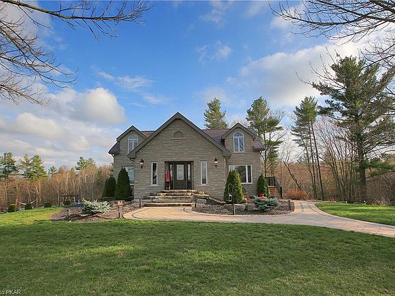 Carefree country living meets authentic resort-style escape. Impeccable stone-front bungalow, 4+ Bedrms, 2 baths, inground pool, cabana, set on 5+ private acres w/trails, stream, backs onto forest. Open Concept Great Rm w/Catheral Beamed Ceilings, Floor to ceiling Brick Masonry Fireplace, Large Windows, High end Designer Kitchen, Granite Island counter, walkout to wrap deck/sunporch. Formal Dining, Primary Bedrm walkin closet. High end Designer Baths. This home is a quality built showstopper, all-inclusive luxury retreat See yourself! Click Brochure/Multimedia for full Prop Features, Virtual Tour, Photos, Drone footage & Floorplan. Mins to Destination town of Warkworth, 90 min to the GTA