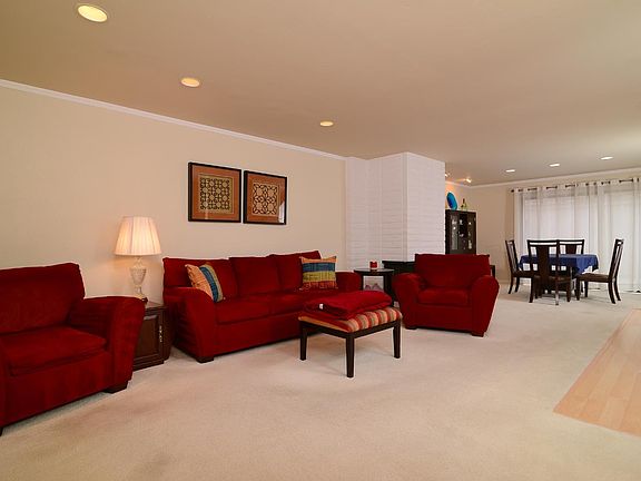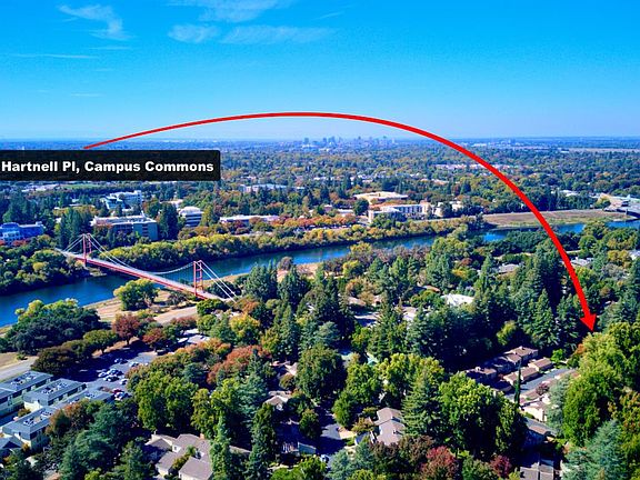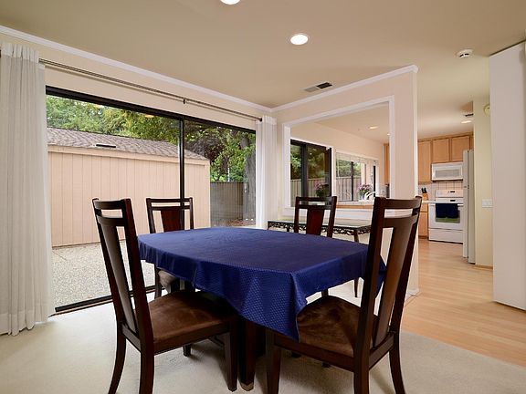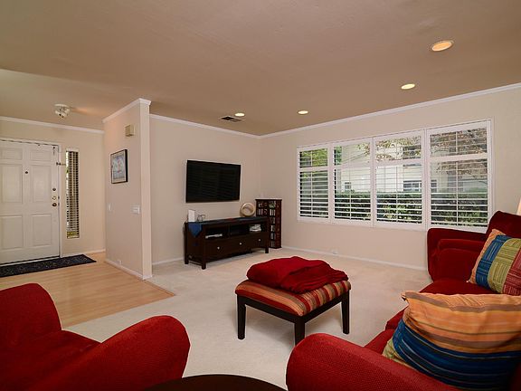Picturesque setting for this rare Robert Powell 1776 model in Village 3, Campus Commons. Move-in ready end-unit filled with natural light and architectural charm featuring a distinctive step-down roofline and high-vaulted, beamed ceilings in stairwell, guest bath, and primary suite. Spacious en-suite primary bedroom offers three closets. Thoughtfully updated with a modern staircase, refaced cabinetry, recessed lighting, shutters, moulding, MARVIN dual-pane Low-E2 patio slider (2024), HVAC & ducts (2020), water heater (2025), and primary ceiling fan (2025). Village 3 dues cover roof maintenance, exterior paint, common areas, pools, spa, tennis courts, and structural hazard/fire insurance. Campus Commons offers a unique combination of lifestyle, location, and scenic beauty to down-size, move closer-in, or just simplify life.