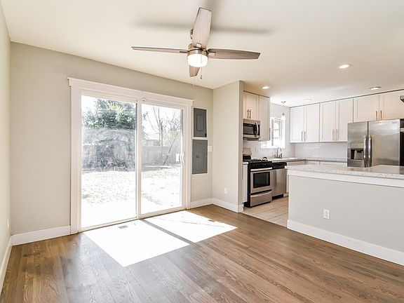 Step into the main living area, where warm hardwood flooring and large picture windows fill the space with natural light. The open dining area seamlessly connects to a beautifully updated kitchen featuring stainless steel appliances, quartz-style countertops, white shaker cabinets, and a tile backsplash that adds a clean, polished look. Sliding doors lead to the backyard, extending the living space outdoors for easy entertaining or quiet evenings.