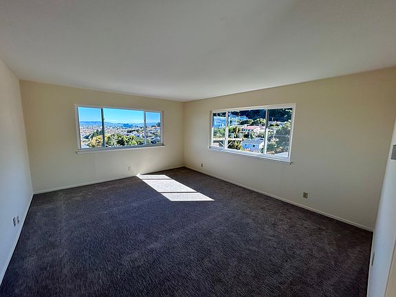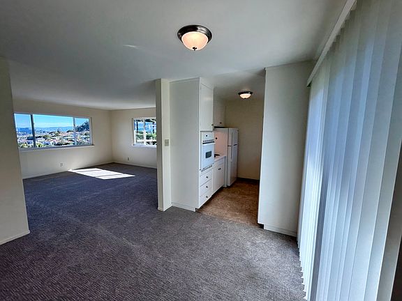The large living room has two window sun exposures with expansive bay views from one side and peaceful nature tree and classic Belmont canyon views out the other side. New window blinds have been installed throughout the unit(since pictures). The living room window lets in lots of light and has beautiful views of the city skyline and the San Mateo Bridge extending over the bay.