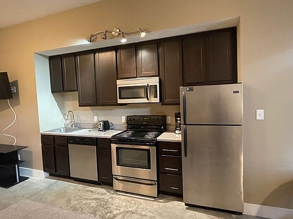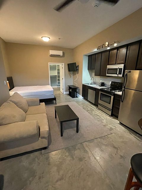 This furnished studio on the first floor has concrete floors, dark chocolate cabinets, and stainless-steel appliances. The spacious bathroom has plenty of lighting and a walk-in shower. Off the bathroom is a large walk-in closet. Laundry Room on same level. 24 hour work out facility on the main level. Water, Sewer, Trash is included. Tenant is responsible for electric. Private lobby and courtyard area. Dedicated large off-street parking lot. Locked keycode access to enter building and unit. Entire building is non-smoking. Building and units equipped with a fire alarm system and sprinkler system. All units have a tankless water heater. One year lease. Shorter lease possible with increased rental rate. Lessor is a licensed Missouri broker.