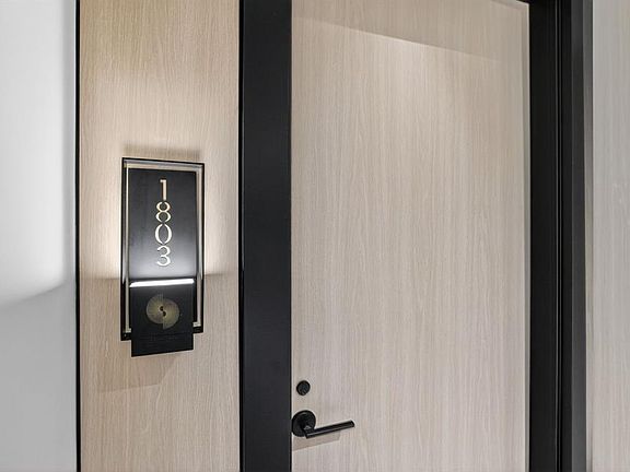Quartz slab backsplashExpansive glass-wrapped great roomCustom modern cabinetryTwo large ensuite bedroomsSubstantial wrap-around balcony