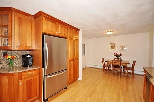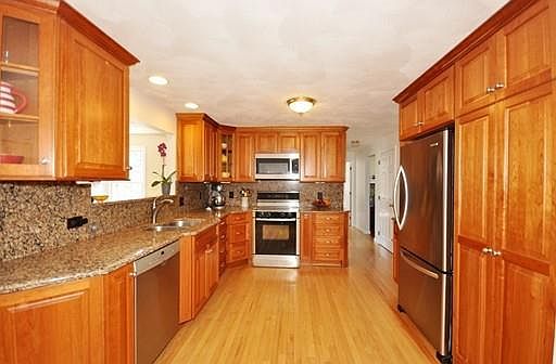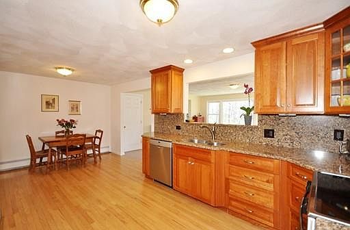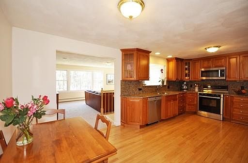 Beautifully appointed and welcoming, this is a house that really feels like a home. It has the perfect family room: picture windows on two walls, brand new carpeting, and a cozy and convenient propane heat stove. The eat-in kitchen was recently renovated with cherry cabinets, Cambria countertops, and stainless-steel appliances; both oven and microwave are convection. The master suite has its own full bath, two closets, and brand new carpet; it even has a balcony! The view of the private wooded backyard is gorgeous and great for seeing wildlife. Thereâs room for everyone to get together in the spacious basement playroom, and the lower level also features a lovely sunroom. This house is just as great outside, where there is a cedar deck with a hot tub, perennial gardens, berry bushes, a vegetable garden, and a patio with lavender plants. And all of this in a very nice neighborhood abutting conservation land. A truly beautiful home, inside and out, this house really has it all!