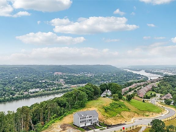 Amazing View overlooking the Ohio River with the city of Pittsburgh in the distance. This is a must see premium homesite. The Regent at River Ridge is a thoughtfully crafted 3-story townhome offering 2,208 sq. ft., 3 bedrooms, 2.5 baths, a 2-car garage, and a finished, walk-out, lower-level rec room—perfect for a home office or media space. The main level features a stylish eat-in kitchen with a 9-foot quartz island, soft-close cabinetry, polished nickel pulls, tile backsplash, and a functional pantry. It flows seamlessly into an open-concept living and dining area filled with natural light. LVP floors are included throughout the main level. Upstairs, three spacious bedrooms include a luxurious owner’s suite with a walk-in closet and private bath featuring quartz double vanities, and a ceramic tile shower with sliding glass door. A full hall bath and upstairs laundry add convenience. Hardie Plank siding and stone accents provide timeless curb appeal and lasting quality.