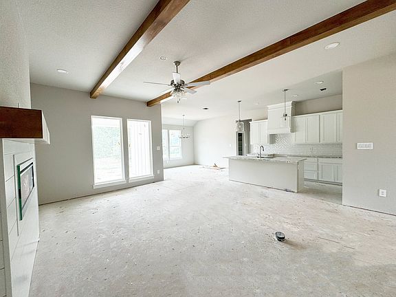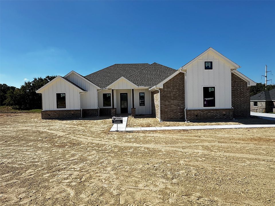 This home beautifully combines Modern Farmhouse charm with timeless Traditional touches. You'll notice the classic board and batten siding, accented with brick, clean lines, and a welcoming front porch that invites you right in. Step inside to an open, airy floor plan where the living room flows effortlessly into the dining area and kitchen—perfect for both everyday living and entertaining. The kitchen is a true centerpiece, featuring granite countertops, a central island, built-in details, huge walk in pantry and stylish lighting that adds warmth and character. A cozy electric fireplace makes the living area feel like home, while the thoughtfully selected flooring—luxury vinyl plank, carpet, and ceramic tile—adds both comfort and practicality throughout the space. Each bedroom includes a walk-in closet, giving you plenty of storage. The spacious primary suite offers a peaceful retreat, complete with dual sinks and a walk-in shower in the en suite bath.