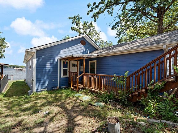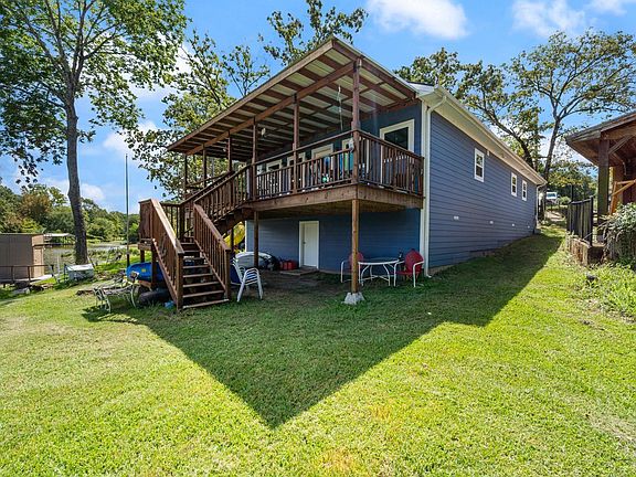 Lake life, your way! This waterfront property was carefully and structurally designed for plenty of room and long lasting memories with family and friends. The shoreline is secured with a durable vinyl retaining wall, and the centerpiece of the property is the multi-level dock, built with stainless steel posts for strength and longevity. It features two boat slips (one with a lift and one without), two jet ski slips, a tanning deck with jump off gate, and chains in place for a removable shade cover perfect for sun filled afternoons or shaded relaxation. Per seller, dredging has been completed, and the property has had water, even in the rain drought years, ensuring year-round enjoyment and worry-free access. Inside, thoughtful upgrades enhance both comfort and convenience. Spray foam insulation improves efficiency, while the bedroom near the living room is insulated for extra sound privacy. The kitchen is designed with functionality in mind, featuring large lower drawers in place of traditional cabinets for easy access and added storage. Beyond the main living spaces, the home includes an impressive amount of extra storage, ample room for lake gear, seasonal items, or anything you want to keep tucked away yet easily accessible. AN EXCITING BONUS: per seller, the boat, jet skis, kayaks, and other lake essentials may convey with the property—making this a true turnkey lake experience. This property is more than just a home; it’s a flexible retreat that adapts to your lifestyle. Host unforgettable gatherings, enjoy peaceful getaways, or settle in for full-time lake living. From sunrise Bible Study on the deck to afternoons on the water and evenings with friends, this home is ready for whatever lake life means to you.