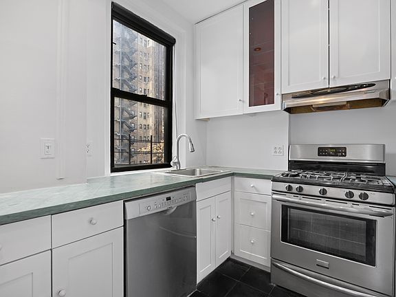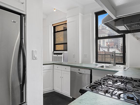 This sun-flooded co-op has it all! The entry hall leads to both the south-facing living room and a formal dining room that has been opened to a windowed kitchen with stainless steel appliances that include a dishwasher and a five-burner stove.