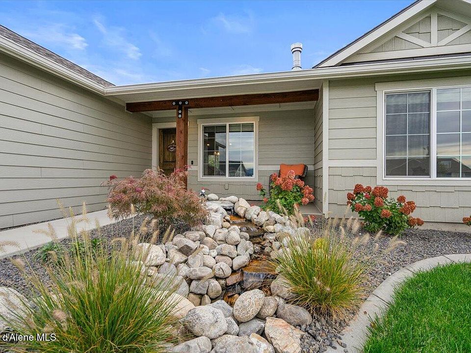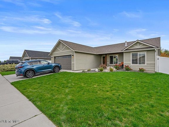 Single-level home featuring 3 bedrooms and 2 bathrooms, offering 1,336 sq ft of comfortable living space. Step inside to discover vaulted ceilings in the great room and easy-care LVP flooring throughout the main areas. The bright, open floor plan is perfect for entertaining guests. The kitchen is a standout with shaker-style Huntwood cabinets, a spacious island, and Moen plumbing fixtures, combining functionality and style. Quality construction sets this home apart, with fiber cement siding adorned with wainscot and gable accents, insulated garage doors with windows, and a highly efficient gas furnace. Curb appeal is enhanced by well-maintained landscaping and sprinklers in both the front and back of the fully fenced yard. Conveniently located near schools, parks, and shopping, this home offers modern living in a prime Post Falls location. Built by Monogram Homes in 2020.