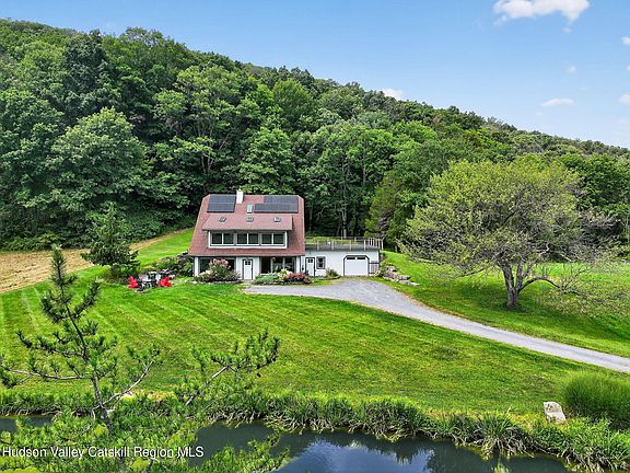 Tucked away on over 17 acres of rolling meadows, woodlands, and open sky, this 3 -bedroom, 2-bath residence offers the rare combination of privacy, comfort, and natural beauty just minutes from the vibrant villages of Saugerties and Woodstock. With 2,394 square feet of light-filled living space, the home showcases timeless craftsmanship and warm natural woodwork, all designed to harmonize with its stunning setting. The centerpiece of the home is the dramatic open-concept living, kitchen and dining area, anchored by a wood stove that creates a cozy focal point in every season. Expansive windows frame views of the pond and surrounding forest, while flooding the interior with natural light. The custom kitchen is equally impressive, offering a balance of beauty and function. Bespoke cabinetry, a generous center island, and thoughtful storage make it a chef's delight, while its open flow into the dining and living areas encourages seamless entertaining. The spacious primary suite is designed as a private retreat, complete with a Jack-and-Jill style ensuite bath and attached laundry room for convenience. Three additional bedrooms provide flexible options—perfect for residents, guests, or a dedicated home office/ studio. This property is all about connection to nature. Just beyond the home, a spring-fed pond invites reflection, recreation, and enjoyment. Above the attached one-car garage, a private rooftop terrace offers elevated views of the property—an extraordinary perch for morning coffee, sunset cocktails, or stargazing at night. With 17+ acres to explore, you'll enjoy endless possibilities for gardens or outdoor projects, and the peace of a landscape that feels worlds away from the everyday. While the setting is private and serene, convenience is never far away. Just a short drive brings you to the cultural, dining, and shopping experiences of Saugerties, Woodstock, and Kingston, with outdoor adventures in the Catskills at your fingertips. Whether you're seeking a full-time residence, a weekend escape, or a creative retreat, this property offers a rare opportunity to embrace the Hudson Valley lifestyle at its finest.