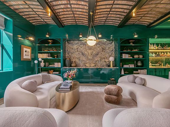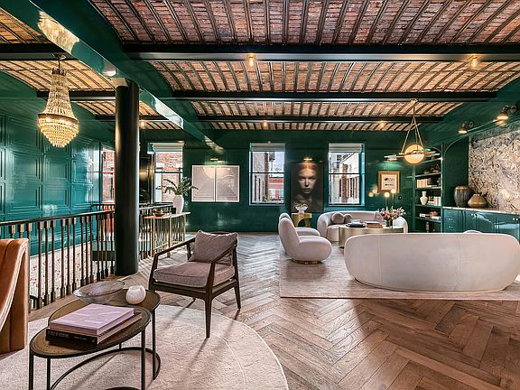Impeccably designed by AD100 recognized Ken Fulk, this four bedroom, six and a half bathroom sprawls approximately 6,000 square feet and is meticulous in its aesthetic and masterfully appointed in detail. Entering this remarkable residence on the 4th floor, you are immediately met by an expansive living space with warm wood tones with brass and marble accents. The kitchen and living areas are unified by a classic Harlequin painted floor and a breathtaking original wood and brick barrel vaulted ceiling. The informal living room centers around a custom-built entertainment center with a charming reading nook tucked under the internal staircase. The breakfast room is graced with a built-in banquette and a stunning brass chandelier. Leaving no detail unconsidered, the chef's kitchen boasts a timeless Lacanche vented range, a massive marble and wood island with a statement worthy, built-in Shaws fireclay sink, and a stunning herringbone marble backsplash. Professional grade SubZero and Miele appliances and a full-size pantry with custom shelving and storage complete this remarkable kitchen. A private corridor leads to three gracious suites, each characterized by their unique, lushly decorated ensuite bathrooms, and boasting ample closet space. A large laundry room with two washers and dryers and a den with full bathroom round out this level. At the top of the elegant bronze and Mahogany staircase, the great room provides a more formal entertaining space. Astounding Art Deco finishes including peacock-lacquered wood paneling, a one-of-a-kind marble swathed buffet, and a glass and bronze jewel box bar complement original features including barrel-vaulted ceilings, iron columns and beams, as well as the gorgeous oak chevron floor. A fully outfitted kitchenette allows for seamless entertaining, and a luxurious powder room provides for convenience. Its own private quarters, the primary bedroom suite is the epitome of tranquility and elegance. Two full ensuite bathrooms, one with a freestanding, claw-foot soaking tub, the other entirely marble and Walnut burl clad, and two custom-built walk-in closets accommodate the dignified and warm bedroom. Sitting behind a high-gloss Mahogany door from the great room, an office adjoins the primary suite through one of the walk-in closets, and could be repurposed as a fifth bedroom. For added convenience, there is a large fitness room with professional rubber flooring. Control4 smart home system controls seven zones of climate and lighting, and a full AV system controls sound throughout. Entries and service entries are provided on both levels. Sitting at the nexus of world-class shopping, dining and culture, 151 Wooster is one of Manhattan's most coveted addresses. On an iconic Soho cobblestone street, it blends the form and function of the artist's bygone loft with the grandeur and opulence of today's most elegant living spaces. The result is an intriguing juxtaposition of history and modernity.