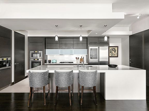 Entertain in style in the expansive, over 50-foot long “great room,” seamlessly connecting the living and dining areas around a sleek fireplace. The high-end, modern kitchen is a chef’s dream, outfitted with custom European cabinetry, thick slab quartz countertops, and top of the line appliances — ideal for both casual meals and elegant dinner parties.