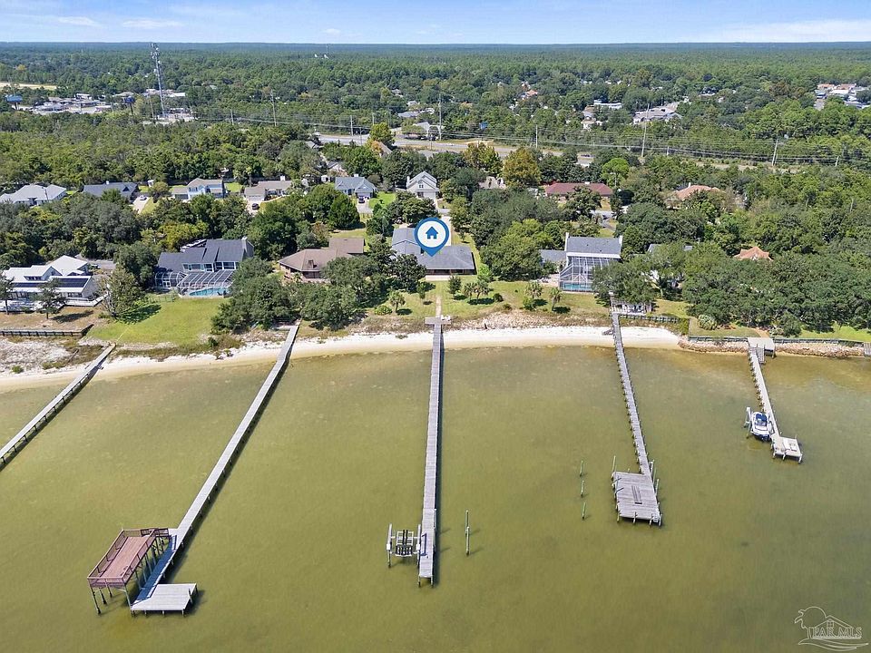 A Rare Waterfront Gem on the Emerald Coast Wake up each morning to sparkling water views and soft white beach sand just steps from your back door. This stunning property offers a lifestyle of serenity and luxury—where dolphins glide past at sunset and boating adventures begin right from your private dock. Situated on nearly an acre, this home is a true rarity on the Emerald Coast. A sweeping 100-foot waterfront property line sets the stage for endless possibilities, whether you prefer relaxing with the sound of gentle waves, jetting out on your sea-doo, or cruising straight across the bay for waterfront dining at Navarre Beach. Inside, the thoughtful split floor plan provides both privacy and comfort. The mother-in-law suite is a standout feature, complete with its own kitchen, living room, laundry hookup, and private entrance perfect for extended family or guests. The main kitchen, truly the heart of the home, is designed to capture breathtaking water views from nearly every angle. Luxury details abound, with travertine flooring throughout, high-end granite, extended-deep garage space, and a large driveway for family and guests. Practical upgrades offer peace of mind, including: Roof (2017) excellent 4-point inspection for low insurance rates HVAC (2022) Two water heaters (one replaced in 2020) Whole-home gas generator (2022) Whole-home water filtration system (2020) Accordion hurricane shutters Rebuilt dock (2021) The outdoor living spaces are equally inviting. A lush, irrigated yard offers plenty of privacy, room for a pool, and an easy-to-maintain landscape. Several steps lead directly to your private beach, while the expansive dock invites you to relax, unwind, or set off on an adventure. After a day on the water, rinse off in the convenient outdoor shower.