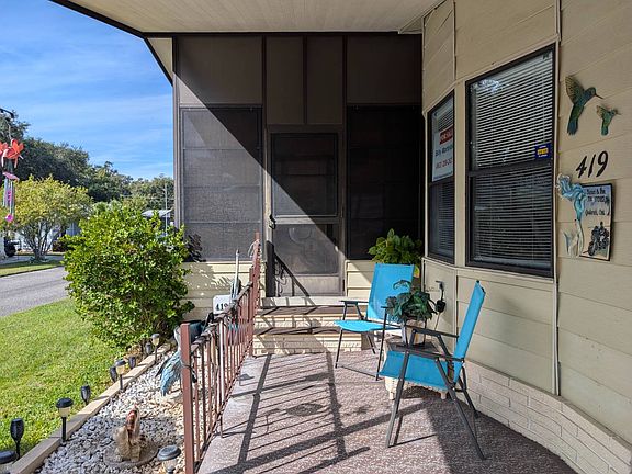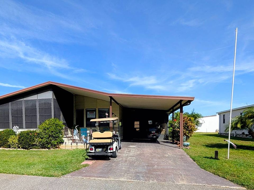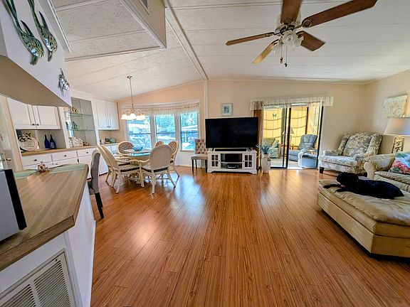 Whether you're looking for the perfect vacation getaway or a comfortable full-time residence, this home truly stands out. Meticulously maintained and tastefully decorated, it comes FULLY FURNISHED, TURN KEY and brimming with extras - everything you need for instant occupancy and carefree enjoyment. Inside, you'll find an open concept living room, dining area and kitchen featuring a cathedral ceiling, with fresh paint in pale neutral colors of sand and sea and modern laminate floors mostly throughout, creating an airy, relaxing ambiance. The maintenance of this great home has also been meticulously cared for, such as a new SHINGLED ROOF 2025, MOTOR REPLACED IN HVAC SYSTEM 2024, MAYTAG TOP OF THE LINE WASHER/DRYER SET 2025 BARELY USED WITH 10 YEAR WARRANTIES. THE CHEF'S DREAM KITCHEN is ideal for meal prep and entertaining and includes all modern kitchen appliances, cookware, glassware,utensils, etc. SPEAKING OF THE KITCHEN! IT IS HAS NEW, BEAUTIFUL AND MODERN CABINET FRONTS FROM FLOOR TO CEILING, AND JUST OFF THE KITCHEN IS THE OPEN DINING AREA WITH ANOTHER WALL OF CABINETRY THAT IS THE SAME STYLE AS THE KITCHEN COMPLETE WITH MODERN HARDWARE AND A TRUE FOCAL POINT TO THIS GREAT HOME WITH MIRRORED ACCENTS AND ATTRACTIVE SHELVING FOR DISPLAYING YOUR FAVORITE ARTWORK OR FAMILY PICTURES FRAMED. EVERYTHING PICTURED STAYS WITH THE HOME EXCEPT A VERY FEW PERSONAL ITEMS! This home offers a master bedroom complete with king size bed, matching bedside tables with lamps between two long windows that reach near the floor, two double sized mirrored closets, and dresser and is open to the the en suite private bathroom with lighted, mirrored double vanities and a step in shower. The guest bedroom also offers a king size bed, furnishings and a double sized closet. The guest bathroom is conveniently across the hall and offers a single vanity and a tub/shower combo bedroom, Both bathrooms have been updated with modern fixtures and linoleum with a tile like finish. The home extends it's living space with a front lanai surrounded by vinyl windows that captures beautiful sunlight, the perfect spot for dining or sipping a glass of your favorite wine. This lanai also offers another entrance to this great home. The owners are graciously leaving all you could need. You can effortless - just pack your clothes and toothbrush, and step right into your luxurious, resort-style Florida lifestyle. Through the kitchen you step out and down to the large screened lanai with a cozy seating area, perfect for entertaining friends and double doors that open to the driveway. At the back of this area is where you will find the utility/laundry area complete with 2025 Maytag washer/dryer set (2025 with 10 yr warranties) This lovely home is located on a quiet street with little traffic. The low monthly lot rent for 2026 is $819 and includes use of all the amenities offered at Woodbrook Estates, Residents enjoy two two clubhouses, two pools, a park with picnic tables, fitness center, shuffleboard, billiards, a library and the friendliest on site management. This gated, pet friendly and age-restricted community is less than two miles to everything, from dining, shopping, groceries,medical centers and more. All Homes are sold 'As Is' without warranties or guarantees by the seller and/or Broker. All listing information is deemed reliable but not guaranteed and should be independently verified through personal inspection and/or by appropriate professionals. The buyer assumes full responsibility for obtaining all current rates of lot rent, fees, or pass-on costs associated with the community, park, or home from the community/park manager