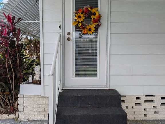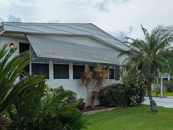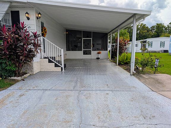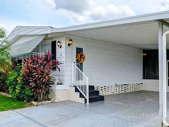 Step in through an elegant entry door with cordless blinds between the glass into the spacious living area surrounded by large bay windows with drop down light colored rattan- like shades that provide privacy while also filtering in light. This room provides a variation of Bohemian style combining tropical foliage of jungle style with a relaxed and yet eclectic feel including rich natural textures and colorful patterns. A pass-through window from the kitchen adds convenience while entertaining guests. Step through sliding glass doors into a the formal living area. This room is a part of the open floor plan which also includes the dining area where much natural light flows in through another set of sliding doors and the spacious,unique shaped kitchen which features all matching white appliances and an abundance of freshly painted cabinetry filled with items such as dinnerware, flatware, and other high end cooking essentials. The dining area offers a hutch with glass front doors on each side that are perfect for showcasing your items. This freshly painted double wide manufactured home is being offered fully furnished with all you see in the pictures and more, making move in day a breeze, especially if being used as a winter retreat. The home offers two fully furnished spacious bedrooms each with walk-in closets, flat screen tvs and two baths. The guest bedroom's walls are painted a soft sage and window treatments that carry on the tropical foliage from the other living spaces. The floors om this room are covered with plush light sand colored carpeting. The guest bathroom is adjacent to the guest bedroom and provides a tub/shower combo and lighted vanity with mirror. The completely furnished master bedroom is located at the end of the hallway and offers a double sized mirrored closet and large windows with vertical blinds. Just off the bedroom is a very long fiberglass vanity and mirror that stretch across the length of the room on one side and a deep walk in closet is provided on the opposite side, also on the same side as the closet are linen cabinets. A door for privacy separates this part of the bathroom from the step in shower and the toilet. The flooring in the kitchen and baths are luxury waterproof plank vinyl with a ceramic tile look. The flooring throughout the remainder of the home has a rich toned wood grain looking finish. Separating the kitchen and the dining area are sliding glass doors that lead you down into the spacious screened lanai complete with outdoor wicker furniture. To the rear of this area is where you will find a large utility/laundry room complete with washer/dryer and laundry sink and also provides shelving and everyday household and landscaping tools. Beside this room is a breezeway and inside this area is a small deep freezer. You are lead into the breezeway through a door with metal slats coming off the lanai and this leads you to a screen door on the other side that exits to the spacious backyard The screened in lanai also features another screened entry door that leads to the driveway, long enough to accommodate one vehicle and a golf cart or perhaps two compact vehicles. The manicured, spacious lot is lined with magnificent palm trees and native plants are abundant. This one won't last long! Move in ready! Call today to schedule a showing! Woodbrook Community, a 55 plus pet friendly, gated community that is very well maintained. They offer amenities such as 2 heated swimming pools and active clubhouses, miniature golf course, shuffle board, library, exercise facility and much more.Conveniently located in the center of Lakeland where everything is literally with two miles, such as restaurants, shopping mall, grocery stores, medical centers and the downtown district. All listing information is deemed reliable but not guaranteed and should be independently verified through personal inspection and/or by appropriate professionals. The buyer assumes full responsibility for obtaining all current rates of lot rent, fees, or pass-on costs associated with the community, park, or home from the community/park manager.