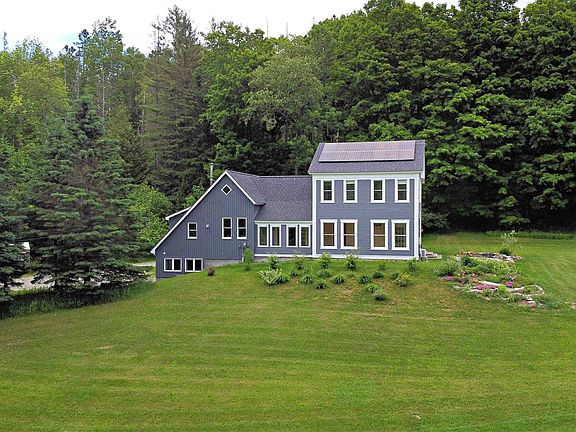 Perched serenely above the road, this striking Peacham home embodies a modern colonial aesthetic seamlessly fused with an emphasis on efficiency and spaciousness. A soaring vaulted ceiling in the kitchen, a cozy dining nook, and abundant storage including dual pantry spaces and ample counter space create a culinary haven. A distinguished central library is surrounded by custom-built bookshelves, while a generous living area adjoins a charming sitting room. Completing the main level is a bedroom, a sizable mudroom with a tiled floor, and a convenient laundry area. This home is bathed in natural light, has hardwood floors, glass doors, beautiful views, and inviting layout. Upstairs, an expansive primary bedroom awaits, featuring its own private second-level porch. A full bathroom and two additional bedrooms round out the second floor. The walkout lower level, currently utilized as a studio, provides abundant possibilities. Equipped with solar panels, a heat pump, and a Tesla battery, this home is as sustainable as it is stylish. Outdoors, the 7.5+/- acres of property offer a stone patio, delightful perennial gardens, sheds, and a sprawling lawn ideal for gardens or animals. Just one mile from the Peacham village, which hosts farmer's markets, community gatherings, and is the epitome of Vermont's quintessential small-town charm.