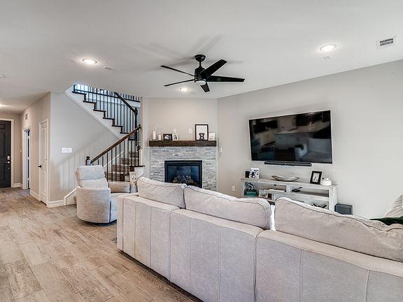 This stunning 4-bedroom, 3-bath home, built in 2020, offers modern living with thoughtful design throughout. The first floor features a private bedroom perfect for guests, along with a dedicated office ideal for remote work. Upstairs, you'll find the spacious master suite complete with an oversized walk-in shower, privacy toilet, large walk-in closet, and automatic shades. A versatile loft area provides additional living or entertainment space. The gourmet kitchen showcases an oversized island, built-in oven and microwave, walk-in pantry, and abundant storage. The open-concept layout flows seamlessly into the living area, anchored by a welcoming fireplace. Outside, enjoy an extended covered patio and an attached two-car garage.