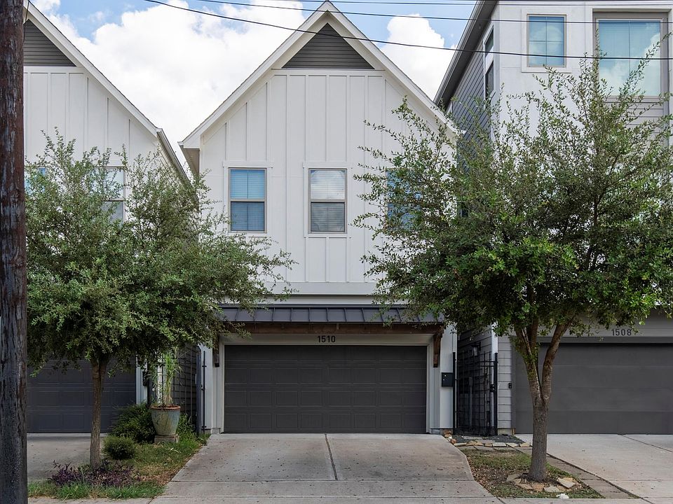 Beautiful recent construction in the heart of Hardy Yards. Modern living meets urban convenience in this stunning home. Enjoy being within walking distance to the Metro Rail, Saint Arnold Brewery, and Downtown Houston, with the Heights and all its amenities just minutes away. This home features a secure gated entry and convenient first-floor living. The open-concept layout showcases designer finishes throughout, including a chef’s kitchen with abundant cabinet space, decorative tile backsplash, a large quartz island with breakfast bar seating, and stainless steel appliances. A mudroom and powder bath are ideally situated off the kitchen near the garage entry. The spacious living room is filled with natural light. The primary suite offers a coffered ceiling and a spa-like bathroom complete with a walk-in shower and a separate soaking tub. Secondary bedrooms share a Hollywood bath. Step outside to your private backyard retreat—perfect for relaxing or entertaining.