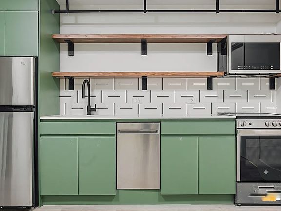 The sleek kitchen is outfitted with stainless steel appliances and generous counter space, making it as functional as it is stylish. The bedroom offers ample closet space and a serene atmosphere, while the spa-inspired bathroom features contemporary finishes and a deep soaking tub.
