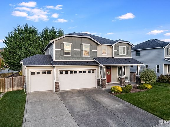 Charming 3-bed, 2.5-bath Richmond American home! The spacious primary suite boasts a 5-piece bath & WIC. Two other bedrooms upstairs, full bath, plus utility room & loft. Open concept downstairs-Living room w/ beautiful gas fireplace. Kitchen features granite counters, SS appliances, gas range, island and eating nook, as well as a separate dining area that could easily be used as a flex space. Outside, enjoy a cozy covered front porch, and covered patio in the back. Backyard includes plum & pear tree as well as grapes. 3-car garage, custom shed w/ loft (electric ready). Extras include tall framing, & sprinkler system. Located in a friendly community w/ parks, experience Orting’s small-town charm & year-round festivals! NOT IN A FLOOD ZONE
