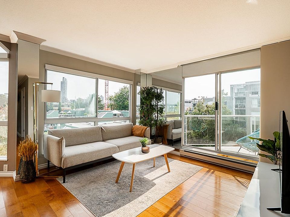 Experience waterfront living in one of Vancouver’s most desired neighbourhoods located steps from Granville Island and the Seawall! This updated PENTHOUSE corner suite offers 990 sqft of interior living space with 2 large bedrooms, 2 bathrooms and an office nook. Excellent open layout with large windows providing ample natural light, wood floors, custom closets, insuite laundry, modern bathrooms, and a sleek updated kitchen with stainless steel appliances. Enjoy beautiful views from your private balcony. Pets/rentals welcome in this well-maintained concrete building with a healthy CRF. Prepaid City of Vancouver lease until 2046, extendable to 2066. 1 parking included. Live where parks, cafés, shops & galleries are at your doorstep! NO PTT. Open House: Sat Nov 22nd, 2:30-4pm.