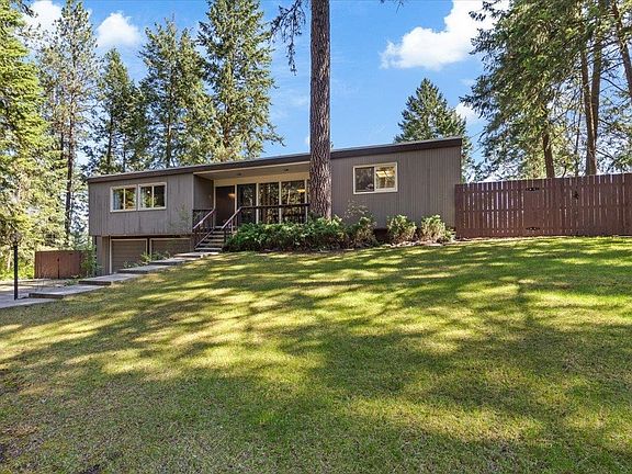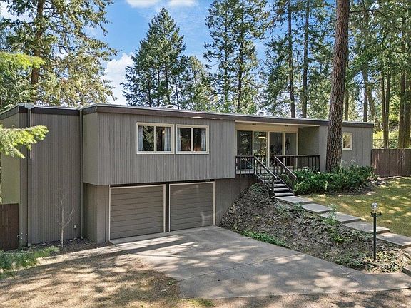 Discover this EXCEPTIONAL mid-century gem, designed by renowned architect Darrel Stebbins. Perched like a treehouse on a private wooded parcel just minutes from Kalispel Golf & Country Club & Whitworth University. This 3 bed, 3 bath home blends timeless design with nature, featuring floor-to-ceiling windows that flood the space with natural light. The main living area boasts a striking fireplace with custom built-ins, creating a warm focal point. The bright kitchen includes artistic stained glass windows & a spacious pantry, while the adjacent family room offers cozy built-in seating & a wood stove. Additional features include main floor laundry, accent lighting, spiral staircase, & a daylight walk-out basement with workshop, bathroom, 3rd family room, & storage. Step outside to a stunning patio, perfect for relaxing or entertaining in the park-like yard. A 2-car garage with rear shop area completes this rare offering.