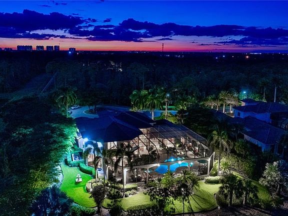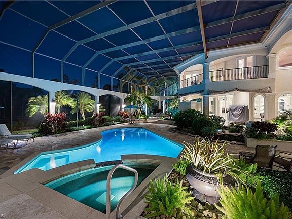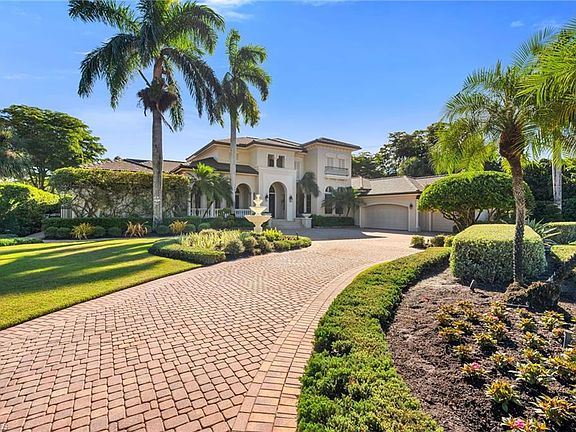 GOLF CLUB MEMBERSHIP available. Absolutely stunning home nestled on almost an acre. Enter the grand front door into the Grande Foyer anchored with a fireplace and curving stair to the 2nd floor and with floor to ceiling windows/sliders and extending to beautiful lanai and the good morning sunrises beyond. New flooring throughout first floor, upgraded to LED lighting throughout, and upgraded light fixtures inside and out. This home is ideally designed for entertaining, from the formal and informal living spaces, the welcoming wet bar complete with wine refrigerators and gracious seating. The artisan designed kitchen is a chef delight with top tier appliances, warming tray, trash compactor, range hood, double oven/coop top, single wall oven, garbage disposal, stainless steel sinks, touch facet on main kitchen sink indoor icemaker, new quartz countertop offering "miles" of prep space, a custom island, and 3 self-cleaning ovens. The Butler's Pantry is well equipped with additional dishwasher and beverage fridges and 2 additional icemakers, loads of storage and additional countertop spaces. 2 reverse osmosis in kitchen and outdoor kitchen. An arts/crafts/workshop room with sink. Each of the generous bedrooms is en-suite and the primary is an oasis of relaxation with a seating area, spacious walk-in closets and leading to a spa inspired bath complete with oversized soaking tub, masterful shower and dual vanities. The lanai is opulent, with a soaring two story screen, cozy covered entertaining space, full outdoor kitchen, 2 TV’s on lanai, outdoor speakers for surround sound, new outdoor fans, all new grill parts for both fireplaces, all overlooking a sparkling pool with integrated spa and soft and hard scaping including a Koi pond with waterfall! Updates include 3 A/Cs new in past 5 years, new roof in 2022, New pool heater and pump, 75 gallon hot water heater, whole house Lutron lighting system, whole house Creston control system, 30 zone whole house water shutoff, whole house water filter softner, termite control around perimeter, indoor/outdoor security cameras, outdoor security lighting, added landscape & landscape lighting, storm screens, garage door spring replaced, garage cabinets, outdoor sink in garage, finished floor & lighting in garage and it is air conditioned! Mediterra offers world-class amenities, including two Tom Fazio-designed 18-hole championship golf courses, a Gulf-front beach club & restaurant, pickleball, tennis & bocce courts, an updated clubhouse, a soon-to-be expanded sports & lifestyle center and more.