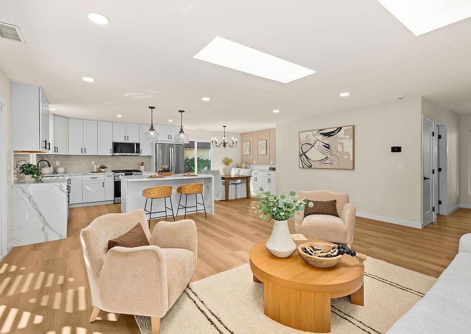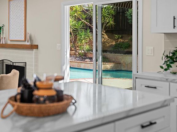 Step inside this fully reimagined bright, open floor plan home filled with natural light and thoughtfully curated designer touches. At the heart of the home, the large open kitchen shines with an island featuring quartz countertops, a waterfall edge and plenty of room for seating and additional storage. Soft-close cabinetry, and a complete stainless-steel appliance package with a tile backsplash add touches of luxury. The dining space is complemented by a built-in buffet and stylish accent wall. Designer lighting and new interior and exterior doors complete the look, leaving nothing left to be desired. The family room is anchored by a tiled fireplace with wood beam mantle, and flows effortlessly into the beautiful backyard. Step outside to enjoy the best of Poway living on your Trex deck with shade pergola, overlooking the sparkling swimming pool and spacious 6,900 sq ft lot, ideal for friendly gatherings or quiet relaxation. Recent upgrades are too long to list but some highlights include a new roof, windows, new front door with keyless entry, luxury vinyl wood plank flooring, kitchen and bath finishes, refinished pool and pool filter, newer HVAC as well as a leased solar system. A built-in safe adds an extra touch of security and practicality. Located just minutes from major retailers, award winning Poway schools, dining, and the I-15 freeway, this home offers the perfect balance of quiet neighborhood living and everyday conveniences. This is sure to sell quickly so hurry up before its gone!