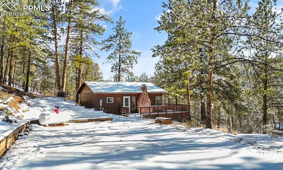 Well-maintained cabin in the gated community of Rainbow Falls Park North, surrounded by National Forest. Year-round water, electricity, high-speed internet, phone service, and snow-plowed access at a mild 6,400 ft elevation. Interior features 1 bedroom, 1 full bath, an additional multi-use room (laundry/sleeping/storage), wood stove, forced-air propane heat, on-demand electric water heater, new hardwood oak floors, and a refinished steel bathtub (2023). The 3.3-acre wooded lot offers ponderosa pines and plenty of level parking and privacy. Wrap-wround spacious, sunlit composite deck. The subdivision includes private stocked fishing ponds with boat ramp, park and trail system, abundant wildlife, and a quiet mix of part-time and full-time neighbors. Other extras include new metal roof with super-insulated attic, underground electric and telephone lines, greenhouse with electrical service, and a tool shed with electrical service. New septic tank scheduled for installation in 2026. Don't miss your opportunity to live the Colorado mountain lifestyle in this exclusive and highly sought after community.