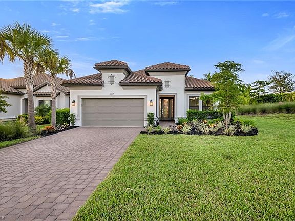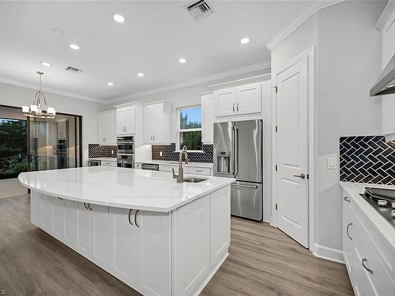 This brand new, immaculate home is perfectly positioned at the end of a quiet cul-de-sac, featuring an extra long driveway and the highly sought-after Lazio floor plan. The upgraded gourmet kitchen impresses with an oversized eat-in island with knee-wall cabinetry for added storage, a veggie prep sink, French door oven, natural gas cooking, and a breakfast nook extension. The open-concept great room showcases stacked sliders that seamlessly connect to the outdoor living area, complete with a covered lanai, privacy wall, and a summer kitchen, ready for a custom outdoor bar. The primary suite includes a cozy sitting area and luxurious finishes, while engineered wood floors add warmth to the primary and guest bedrooms. Additional highlights include a sleek snakeskin-fleck epoxy garage floor. Enjoy spectacular sunset views and world-class amenities at Esplanade by the Islands, including a resort-style lap pool, Bahama Bar, tennis, pickleball, state-of-the-art fitness center, full-service spa, and salon. Ideally located between Marco Island and downtown Naples, this home offers the best of both worlds, just 20 minutes to the pristine beaches of Marco and the dining and shopping of 5th Avenue.