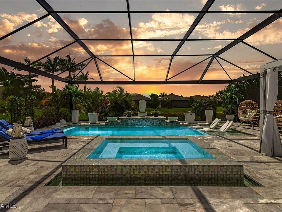 Esplanade by the Islands is the Hottest new Resort community in Naples with World class amenities, Clubhouse, Spa Salon ,Fitness center, Bar, tennis, pickle and bocce ball courts plus a lively social calendar. This Lazio model is a gorgeous 3 bedroom 3 bath plus den home shows like a model and professionally decorated by an interior designer. It includes over $600k of builder options & designer upgrades located on a large Cul de Sac lot. High end designer light fixtures and custom designer wall treatments are throughout the entire home . A spectacular floor plan includes a library, great room, dining room, gourmet kitchen with high end appliances ,a kitchen nook and bar with wine fridge all overlooking an outdoor oasis . An extended covered lanai and pool deck is over 2100 sq. ft of travertine marble, a marble fireplace, tiled walls, outdoor kitchen in white quartz and white marble bar. The pool has an infinity 12 person tiled spa and a double waterfall wall with water bowls and an extensive lighting and bubbler package overlooking the lake. The master suite, and two other bedrooms all have sumptuous full baths and the master closet is amazing ! Do not miss seeing this gem !