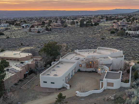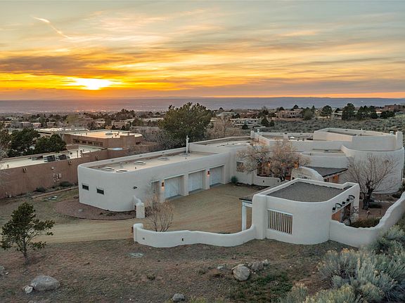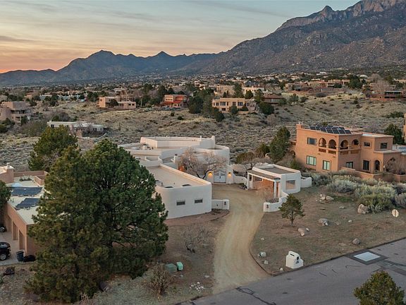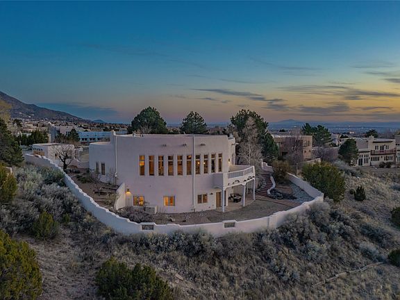 Timeless, charming, and classic custom Santa Fe-style home in Sandia Heights boasting Panoramic views of the Sandia Mountains and the ABQ city skyline. Meticulously designed, warm architectural features including smooth diamond plaster and exposed adobe wall finishes, 5 Kiva fireplaces, T&G beamed ceilings, stone flooring, and natural light from the abundance of windows! Chef's kitchen with Miele, Subzero, and Wolf appliances. Enjoy the theater or outdoor living spaces w/courtyards, balconies, 2 fireplaces, and breathtaking vistas overlooking North Pino Arroyo w/daily wildlife crossing, majestic sunsets, & starlit skies that provide a serene and peaceful setting. It's the outdoor enthusiast's paradise with nearby hiking/biking trails, a true masterpiece and it could be your ABQ Dream Home!