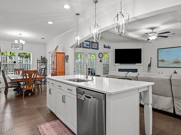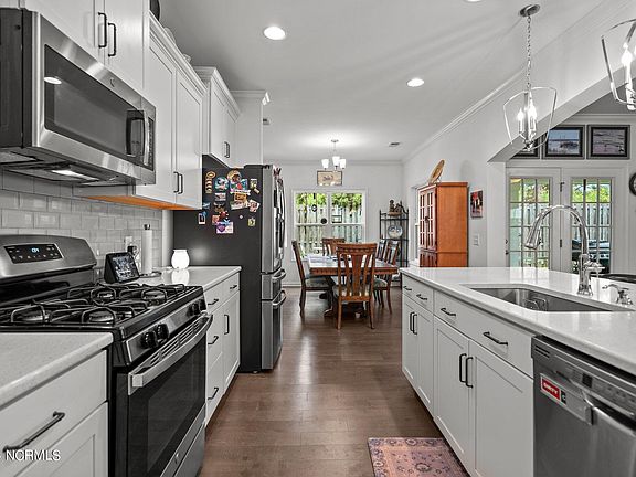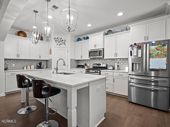 Gorgeous like new transitional home w/ fenced-in back yard on large cul-de-sac lot! First floor primary bedroom suite w/ dual sinks, shower/soaker tub, and large walk-in closet. Stunning kitchen w/ white shaker cabinets, center island, quartz countertops, and stainless appliances, spacious breakfast room plus formal dining room w/ coffered ceiling. Open living room w/ arched opening and fireplace, rear screened porch, covered front porch, and finished 2-car garage! Upstairs features 2 bedrooms, full bathroom, and bonus room! Recent white interior paint, wood/LVP flooring, and premier collection upgrades! Small, peaceful neighborhood conveniently located close to downtown Wilmington, Wrightsville & Carolina beaches, restaurants, and shopping! Come visit your next home soon as it is a Must See!