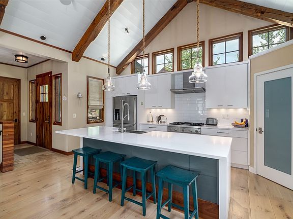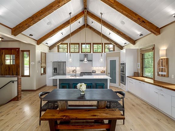 This extraordinary home is truly a masterpiece of custom design, blending the allure of a beach house with mountain living in the Fish Creek Falls area. Offered fully furnished and crafted with meticulous attention to detail and the highest standards of craftsmanship, every aspect of this unique residence speaks to artistry and luxury. The main floor features an inviting floor plan with an open kitchen, dining area and living room all freshly painted with vaulted ceilings, high end appliances, quartz countertops, white oak flooring, walnut trim and doors. The artistic features throughout the home include reclaimed barn wood beams in the great room, bordering the steel façade gas fireplace, and creating a one of a kind multi-dimensional wall in the stairwell. The main floor primary bedroom exudes calm and has a serene and timeless bathroom with soaking tub, glass shower, and walk in closet. The lower level offers 3 more bedrooms, 2 full baths, a family room and walk out access to the private hot tub, covered patio, and backyard. Unrivaled outdoor space with landscaping like you’ve never seen with a water feature flowing through the yard, meandering by a stone patio with fire pit and ending at a beach area. Ample manicured lawn, extensive rock work, and native plantings complement the mature aspen trees. Off the main living space you will find more outdoor living with a deck offering both covered and open areas with room to dine, grill, relax, or even pitch a tent for kids in the summertime! Positioned to capture southeastern mountain views, this home welcomes the morning sun and alpenglow over the Steamboat Ski Area in the evenings. The attached two car garage has built in storage, an outdoor shed provides additional space for gear, and a bonus hideaway climbing room closet. Whether you're entertaining guests or seeking solitude, every space in this home has been carefully designed to maximize comfort and aesthetic appeal.
