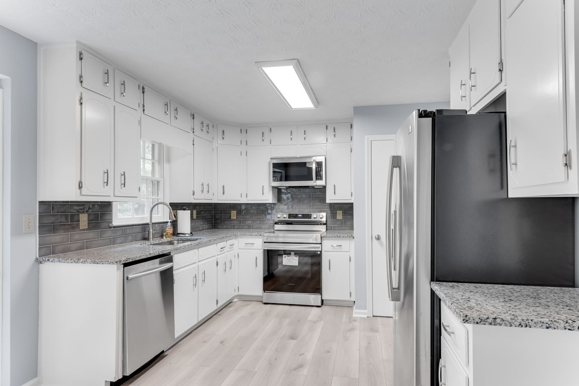 UPDATED home on just under 1/2 acre lot! Interior shows like NEW construction! The rocking chair front porch leads to the vaulted great room boasting luxury vinyl floors that expand throughout the home including the bedrooms! NEW lighting package throughout. Beautiful white kitchen offers 42" cabinets, NEW ...