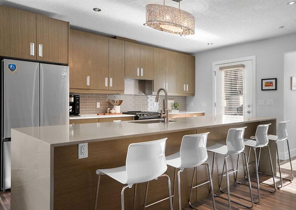 This stylish and sun-filled townhouse in Bankview offers the perfect blend of modern design, functional space, and unbeatable value. Featuring two heated and secure underground parking stalls, this home stands out with thoughtful upgrades and a layout ideal for both everyday living and entertaining. The open-concept main floor is anchored by soaring 9-foot ceilings and durable laminate flooring throughout. A spacious living room offers plenty of room to relax or host guests, while the kitchen is a true showpiece with a large waterfall quartz island, undermount sink, stainless steel appliances, gas range, and a deep pantry with both open and closed storage. The adjacent dining area is surrounded by two walls of south-facing windows, filling the space with natural light. Just outside, a shared patio with gas hookup creates a perfect spot for summer evenings and weekend lounging. A convenient two-piece bathroom completes the main level. Upstairs, both bedrooms are generously sized and feature their own private ensuite bathrooms and built-in wardrobes. The primary suite is oversized with excellent storage and a sleek 4-piece bath. The secondary bedroom features a five-piece ensuite, additional closet space, and its own private south-facing balcony overlooking the courtyard. The upper level also includes the laundry machines, conveniently located near both bedrooms for added ease and efficiency. With secure underground parking, modern finishes, and a location close to transit, shopping, parks, and the university, this home is the total package. Monthly condo fees include everything except electricity, offering true peace of mind in this turnkey property.