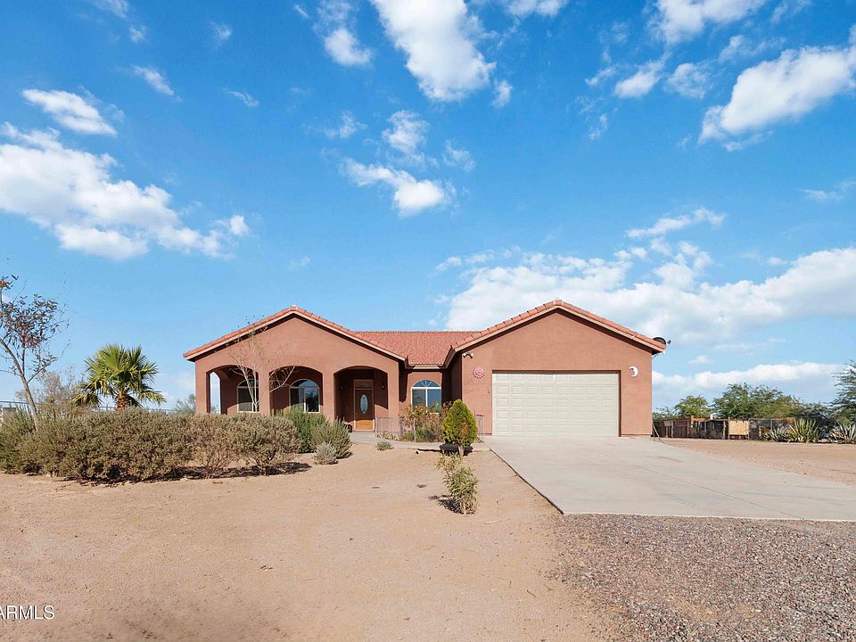 Experience the best of Arizona's rural living in this beautifully crafted 3-bedroom, 2-bathroom custom home on 1.25 acres with No HOA. Perfectly positioned for privacy, security, and wide-open space, this property is fully gated and ready for your horses, RVs, boats, and all your toys. Step inside to an open-concept great room with vaulted ceilings, tile flooring throughout, and a split floor plan for maximum comfort. The kitchen shines with granite countertops, stainless steel appliances, with a gas stove for cooking and entertaining. Your primary suite features dual sinks, a walk-in closet, and a walk-in shower for a spa-like retreat. Outside take in the mountain views, desert skies, and AZ sunsets on the full-length patio. The RV gate is perfect for trailers, toys or extra parking. With no HOA restrictions and horse privileges, you have the freedom to truly make this property your own. Located just minutes from I-10, you'll enjoy a tranquil desert lifestyle with an easy commute to the Phoenix metro area. Whether you're seeking space for animals, a secure place for your toys, or simply the peace and quiet of rural Arizona, this home offers it all. Welcome Home! Also for lease MLS 6906809.