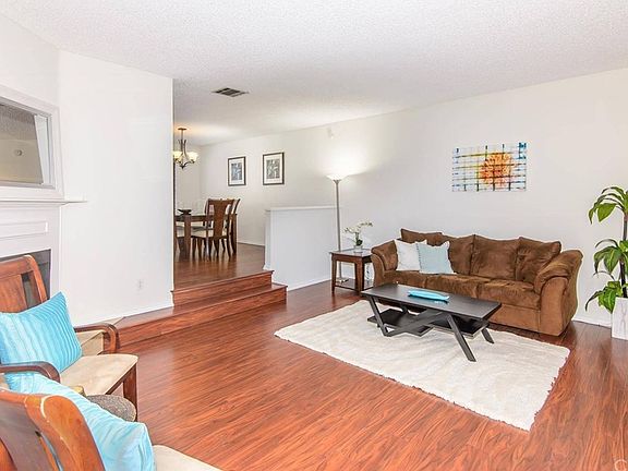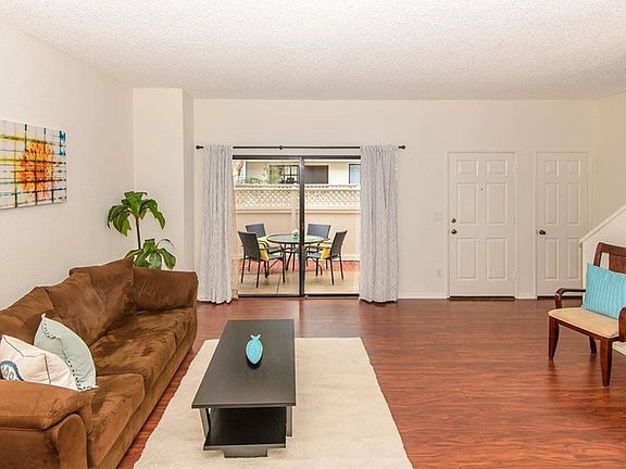 Enjoy this private tri-level townhome tucked away in the gated community of La Palma Estates. This 3 bedroom, 2.5 bath townhouse has new laminate flooring, has been freshly painted, ceiling fans in the bedrooms, and is ready for move in! It features all three bedrooms on the top floor. The master bedroom has a large walk in closet, as well as it's own private bath. The kitchen features a stainless steel range, built in microwave, dishwasher, and trash compactor. Directly off the kitchen is a large dining room and step down living room with gas fireplace. The living room opens out to a private fenced in patio. There is plenty of closet space throughout and additional storage space in the large bonus/ laundry room just off the 2 car attached garage. The HOA includes guest parking, a swimming pool, spa tub, and grassy playground area! Don't miss out!