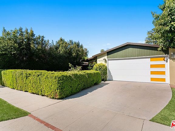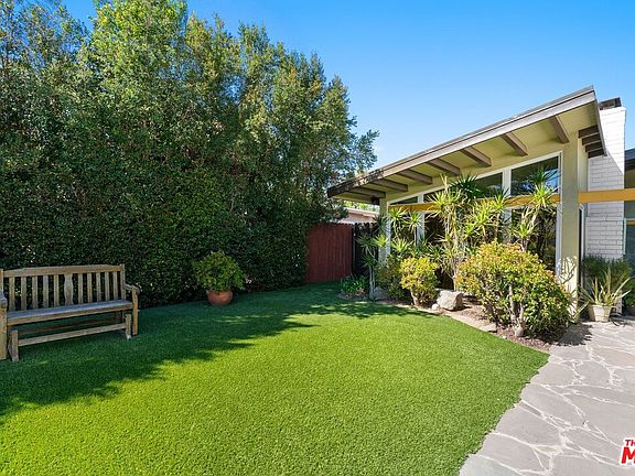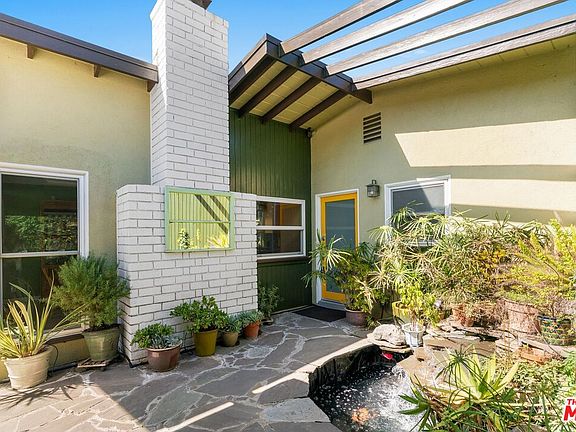 Nestled in the coveted area of Kester Ridge, this stunning 1955 Mid-Century Modern has been lovingly restored and updated to maintain the integrity of the era. Walk up and observe the iconic roof lines and impeccable colorful palette. Hear the sound of a rare front courtyard waterfall/pond, surrounded by lush fruit trees and foliage, creating a private garden oasis. The beautiful light filled kitchen features maple cabinets, flamed granite counters, large island with extra storage, custom tile, a gas fireplace, breakfast area, wine fridge, washer/dryer and farm sink looking out to a bonus side garden. The open living/dining area features a high vaulted, wood beamed ceiling and a wood-burning fireplace. Floor to ceiling windows flood the living space with light and lead you to your expansive entertainer's backyard sanctuary featuring a large patio with built-in BBQ/bar, gas fire pit and fountain, and lush garden yard. All bedrooms are tucked away down the main hall & include a full bath and in suite master bath. This exceptional piece of preserved history is a one-of-a-kind wonder that won't last.