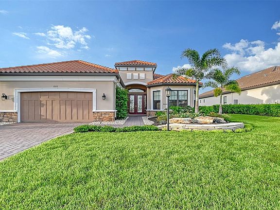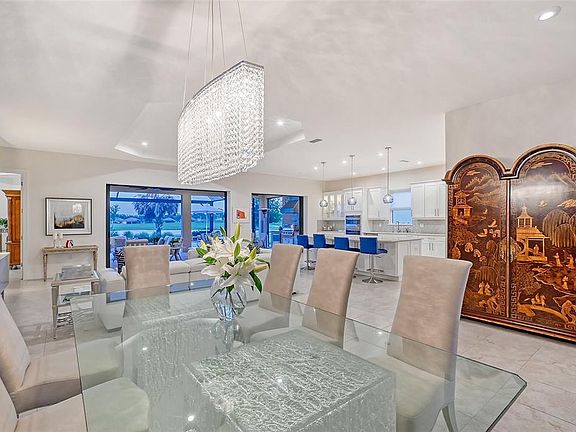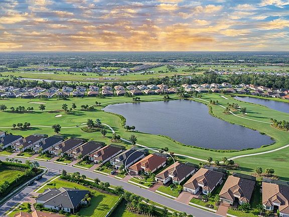 Upon entering this Pallazio open floor plan through exquisite glass double front doors, you are immediately greeted by breathtaking golf and lake views. This residence is a lavish display of award-winning design, featuring custom finishes and masterful craftsmanship throughout. The seamless indoor-outdoor Florida lifestyle is embraced through double pocket slider doors that lead to an extended covered lanai, an enchanting heated pool with Lutron color-changing lights and waterfall pots, a clear view cage with stunning golf and water views, and an outdoor kitchen complete with grill and range hood, sink, storage cabinets and stone countertops. Inside, the spacious family room overlooks an open kitchen and dining area adorned with custom lighting. The kitchen is a chef’s dream, boasting exquisite wood cabinetry with pullout shelves, an extended island with quartz countertops and additional front cabinets, top-of-the-line appliances, an extended bar with glass cabinetry, a walk-in pantry, gas cooktop, under-cabinet lighting, designer glass backsplash and a water filtration system under the sink. The primary suite is an oasis of comfort, featuring an extended sitting area with bay windows, tile floors, motorized shades, stunning golf and lake views, and a luxurious bath with an oversized glass walk-in shower, double vanities with quartz countertops, and a spacious closet with custom built-ins. The guest rooms are generously sized, each with en-suite baths and framed glass mirrors. A den/office with glass French doors, motorized shades, and built-in shelving completes the interior, leaving no detail overlooked. Additional highlights include impact windows in the front and hurricane shutters, custom lighting in every room, a built-in Closet Tec system in all closets, storage racks in the extended three-car tandem garage, gutters around the entire house and landscape lighting throughout. This golf membership home offers access to world-class amenities, including a resort-style pool with a Bahama bar, an onsite restaurant, wellness and fitness centers, sports courts for tennis and pickleball, and an incredible golf course with a practice range. This is luxury living at its finest.