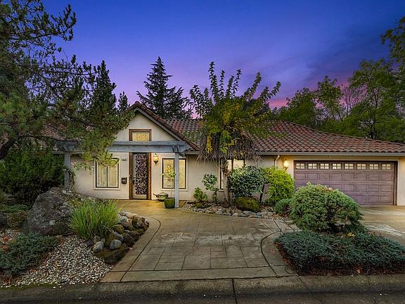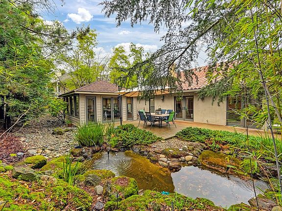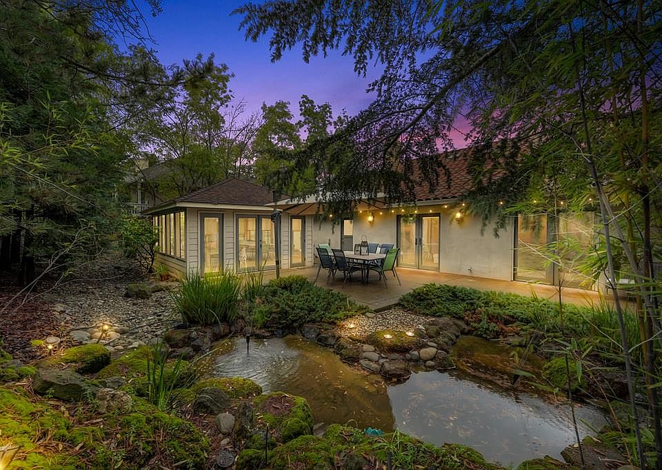 Peaceful waterfallKoi pondRemodeled single story homePicture and clerestory windowsTwo spacious primary suitesCenter island kitchenMarble counters